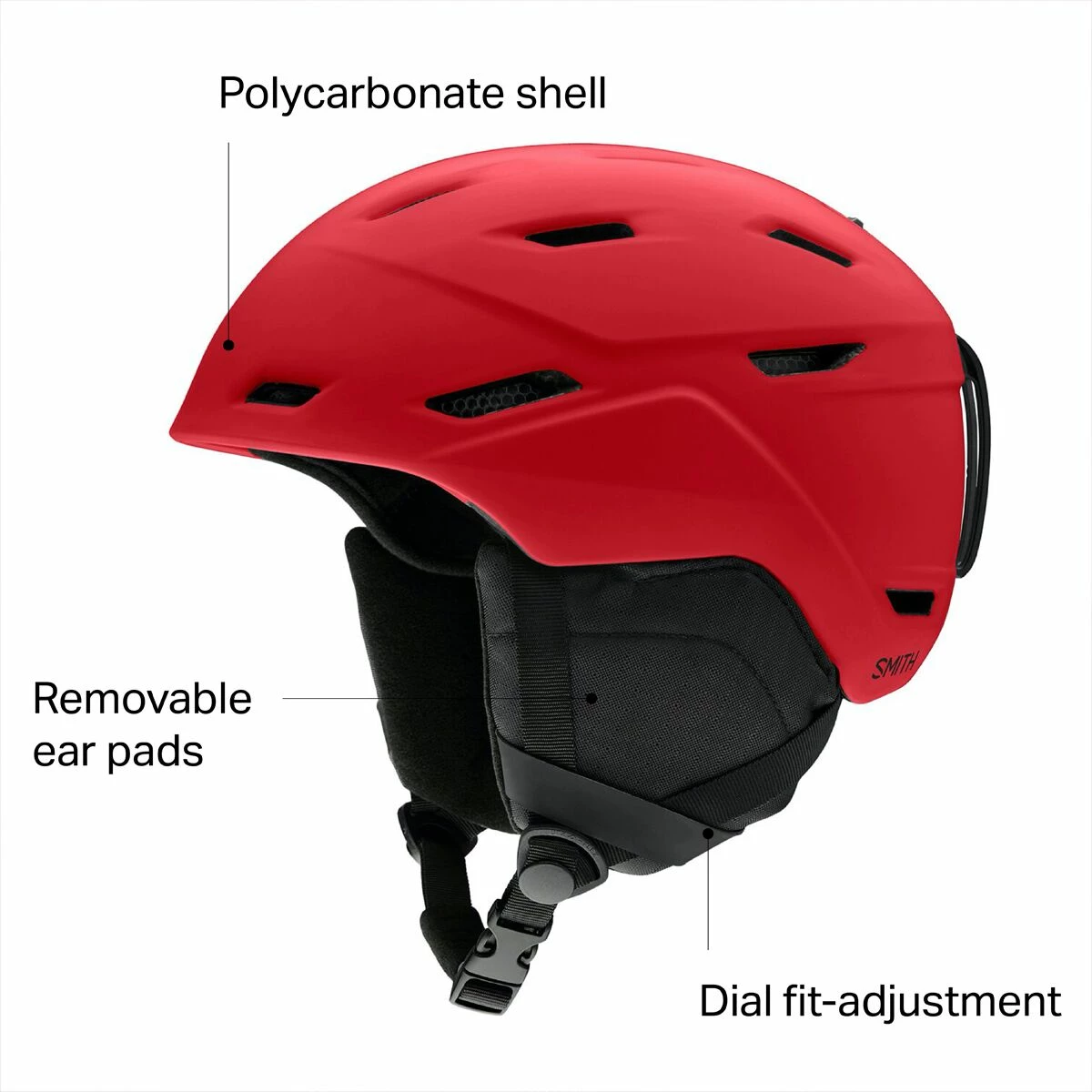 The Smith Mission Helmet finds itself right at home when cruising down groomed runs at the resort or through the trees in the backcountry alike. Built with an EPS foam interior and polycarbonate shell exterior, the helmet helps to absorb impact force when taking a fall or riding past the occasional low hanging branch. Adjustable ventilation control allows for heat to escape the helmet while riding, or it can lock in warmth on extra cold days by closing the easy to use slider system. When the day lasts from first to last chair, an adjustable dial system lets the helmet take pressure off the head and allow for a comfortable fit.